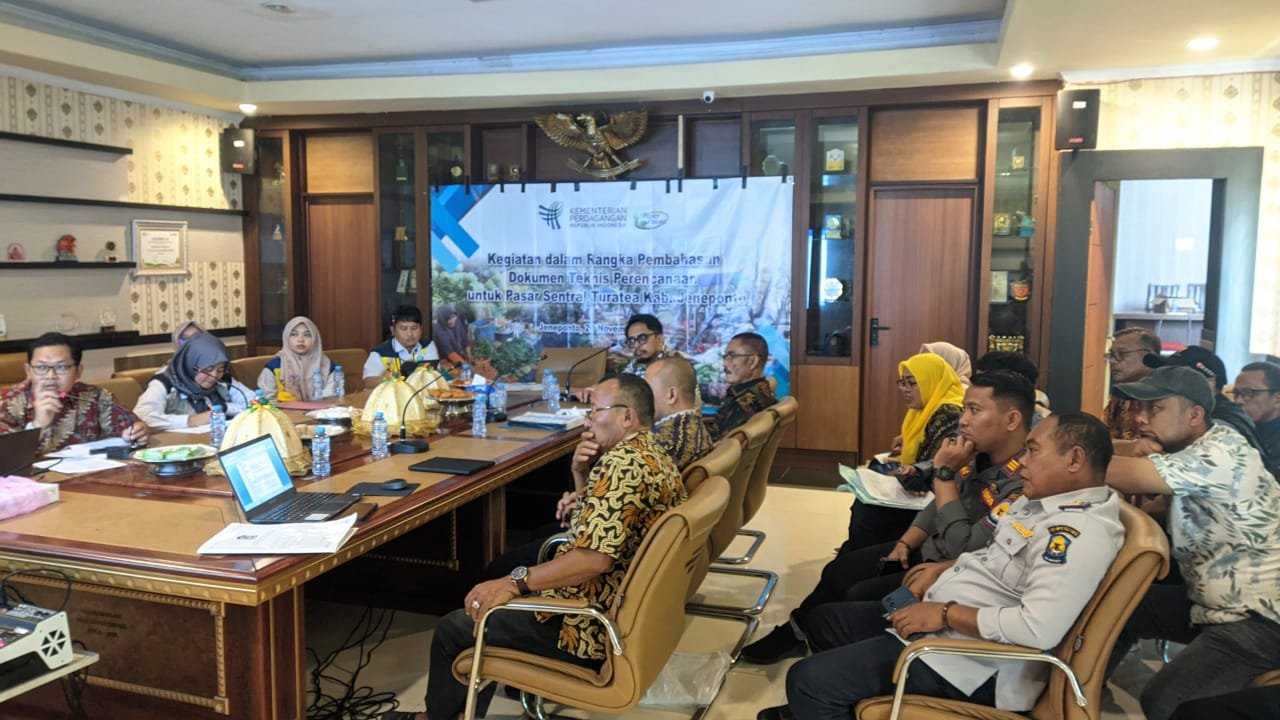 Rapat tersebut melibatkan perwakilan dari Kementerian Perdagangan serta Kementerian Pekerjaan Umum dan Perumahan Rakyat (PUPR) sebagai mitra strategis yang berperan dalam sinkronisasi teknis, regulasi, dan dukungan pemerintah pusat. Hadir pula Kepala Bappeda Jeneponto, Dr. H. Alfian Afandy Syam bersama perangkat daerah terkait.