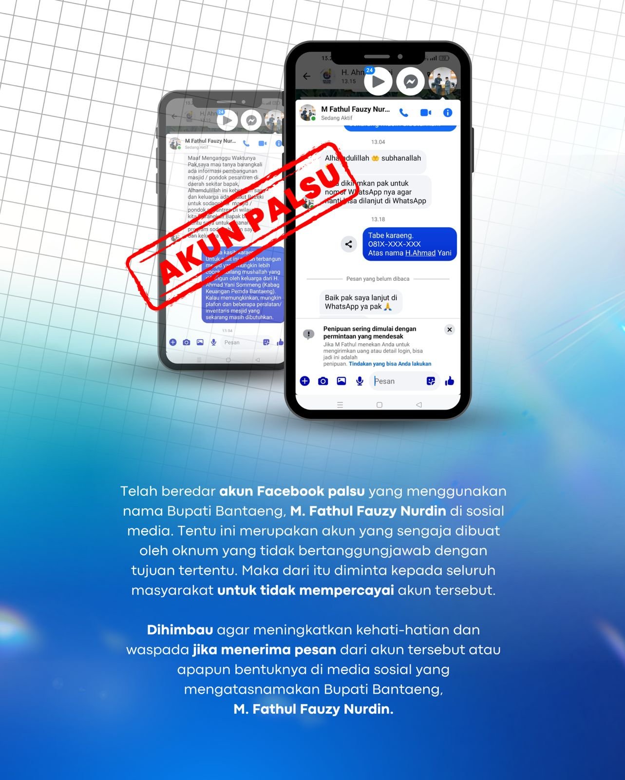 BANTAENG, INFOUPDATE - Masyarakat diminta waspada dengan modus penipuan yang mengatasnamakan Bupati Bantaeng, M. Fathul Fauzy Nurdin pada akun-akun sosial…