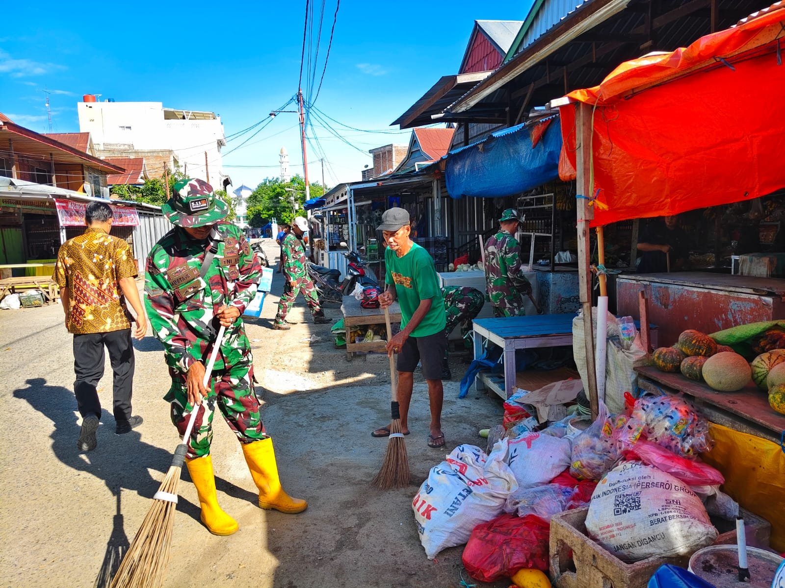 Melalui semangat gotong royong, personel Koramil dan warga bahu-membahu membersihkan setiap sudut pasar guna memastikan kebersihan tetap terjaga dan tidak menimbulkan bau maupun gangguan kesehatan.