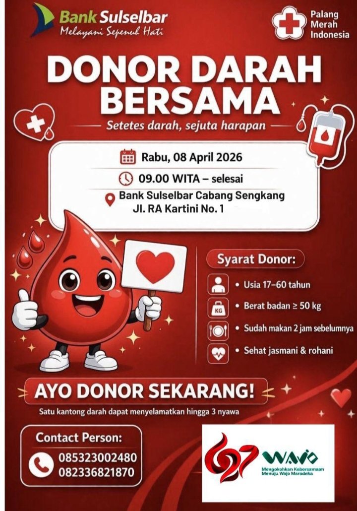 SENGKANG, INFOUPDATE – Bank Sulselbar Kabupaten Wajo akan menggelar aksi Donor Darah di halaman kantor setempat di Jl. R.A Kartini, Kecamatan Tempe pada Rabu, 8 April 2026
