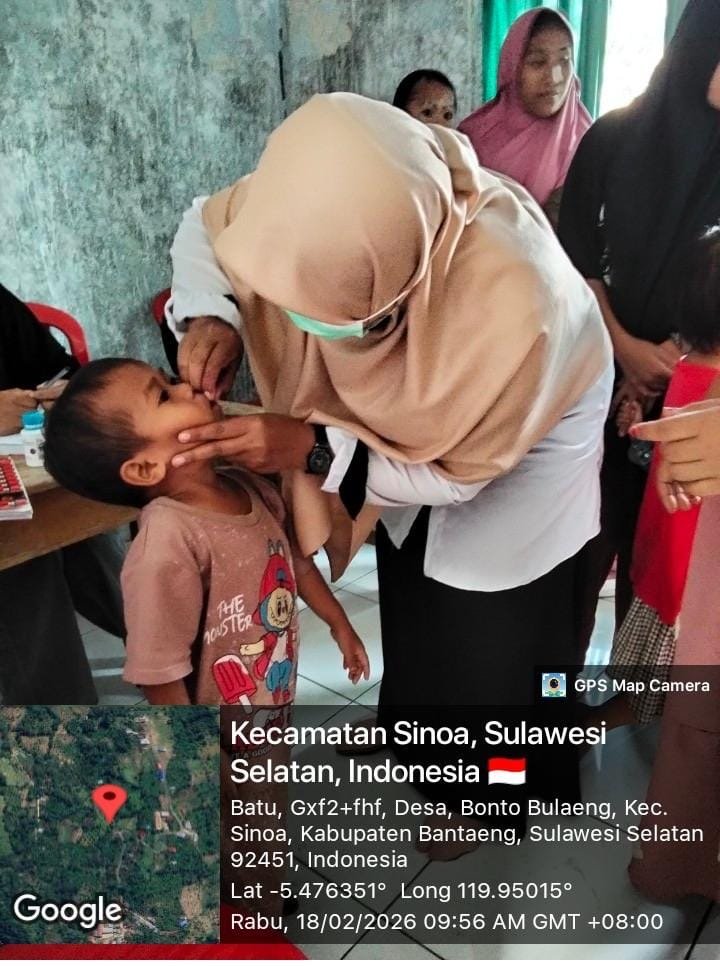 BANTAENG, INFOUPDATE – UPT Puskesmas Sinoa melaksanakan pemberian Vitamin A kepada anak di Batu Tiroa, Desa  Bonto Bulaeng, Kabupaten Bantaeng pada Rabu, 18 Februari 2026
